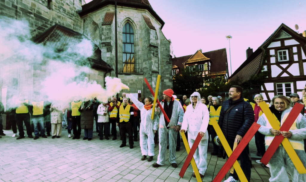 Wir Trassengegner haben den Abschied der Firma Tennet aus ihrem Büro in Altdorf mit ein wenig Lärm und Qualm gebührend gefeiert.